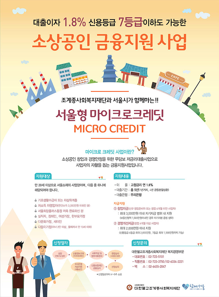 사업자금, 생계비, 교육비 등을 목적으로 1,000만 원 내외의 소액 대출을 저리로 제공합니다. 기초생활수급자도 신청 가능하며, 재단의 심사를 거쳐 승인됩니다.