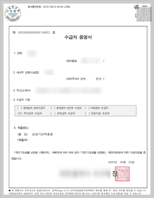 - 기초생활수급자 증명서, 가족관계증명서, 소득증명 등이 필요할 수 있습니다.
