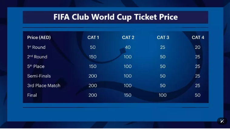 클럽 월드컵 토너먼트 의 더 큰 흥분과 인기를 위해 , 그들은 거대한 광고와 브랜딩으로 경기장의 모든 팬을 보고 싶어하기 때문에, 축구 팬들은 언제든지 자신의 선택에 따라 티켓을 신청할 수 있습니다. 팬들은 FIFA 공식 사이트에서 티켓을 신청할 수 있으며, 아래의 호스피탈리티 패키지도 확인할 수 있습니다.